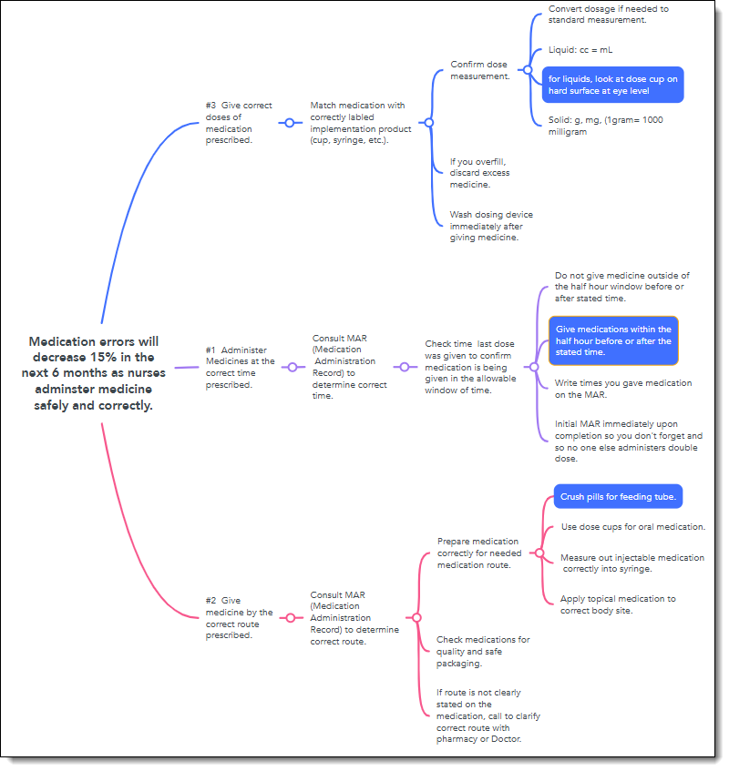 After writing the business goal, “To reduce medication errors by 15% within six months,” the action map was used to highlight 3 key behavioral changes that became the focus of the scenarios in the e-learning.